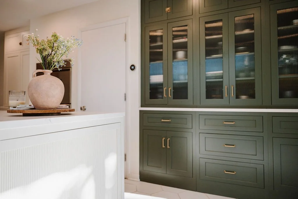We designed this kitchen to complement the vintage charm of the home, nestled in Westwood. We introduced a custom shade of green to highlight the natural woodwork, paired with aged brass and Calacatta gold countertops for added character. Opting for lower cabinets only, we embraced a modern approach that plays with the space's unique appeal.